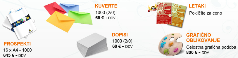 Za vse tiskovine vam nudimo tudi grafično oblikovanje in pripravo za tisk. V primeru naročila grafičnega oblikovanja in tiska skupaj vam nudimo 50 % popust pri oblikovanju.